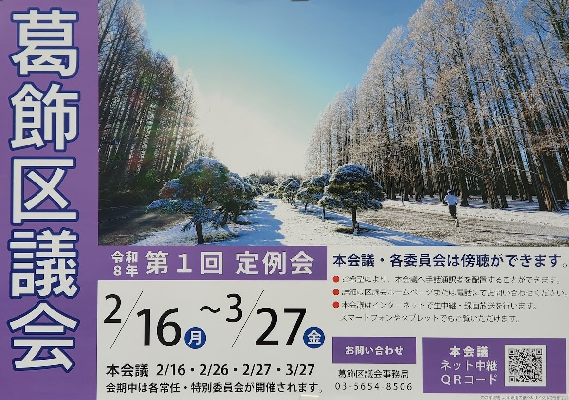 2026年2月16日(月)~3月27日(金)の40日間の第1回定例区議会がはじまります。