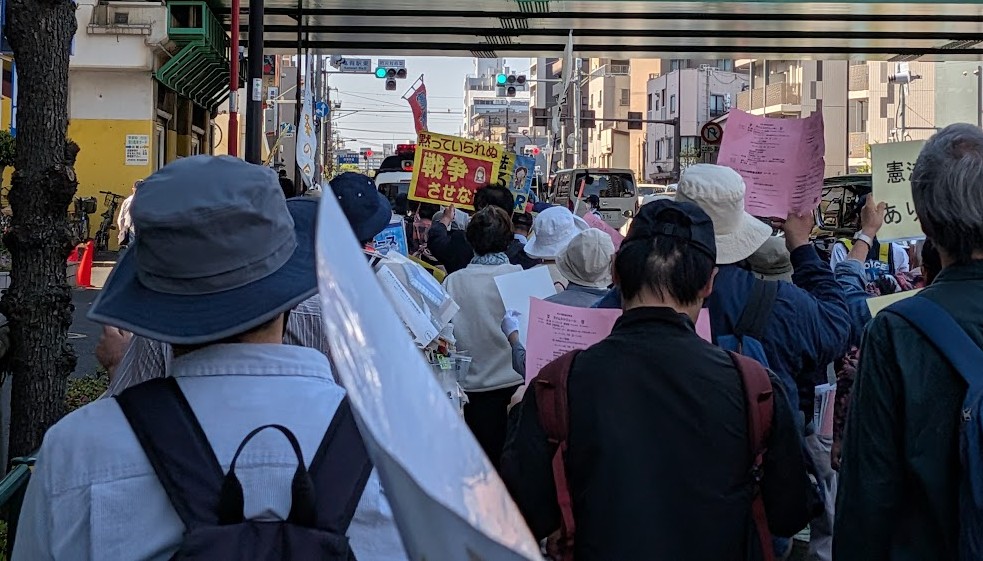 集会後は亀有周辺をパレードしアピールしました。はじめて今回の集会に参加した人はいずれ国会前にも行きたいと話していました。安保法制のときも多くに人たちが国会前に集まったことを思い出しますが、今回は若い人たちが多く参加していることが希望です。高市総理が訪米してトランプ大統領に対して、ホルムズ海峡への自衛隊派遣を見送ることで理解を得ることができたのは憲法9条があったからではないでしょうか。武力で平和は守れないからこそ、地域から反戦・平和を訴え続けていきます。